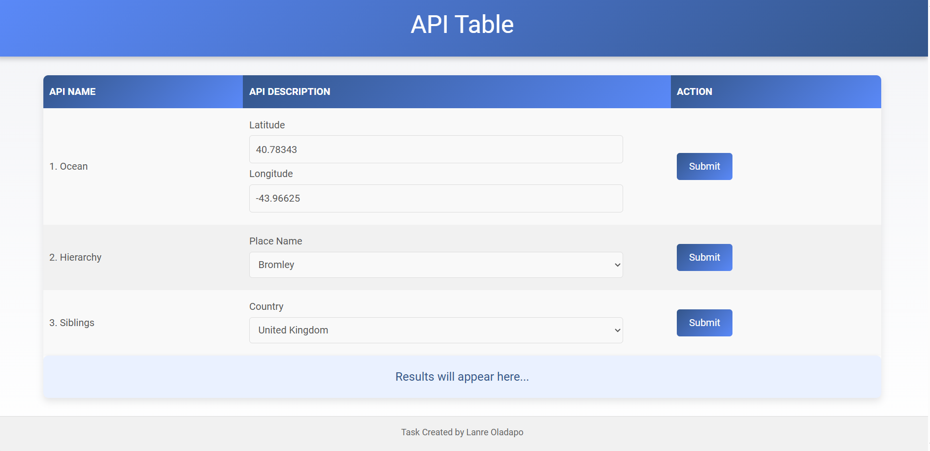 This application, built with HTML5, CSS3, JavaScript, jQuery, and PHP, integrates three APIs—Ocean, Hierarchy, and Siblings—to retrieve geographic data based on user input. Users can: Enter latitude and longitude to find ocean details. Select a country to view its administrative hierarchy. Choose a placename or attraction to see related locations. Each API section includes a Submit button to process inputs and display results.