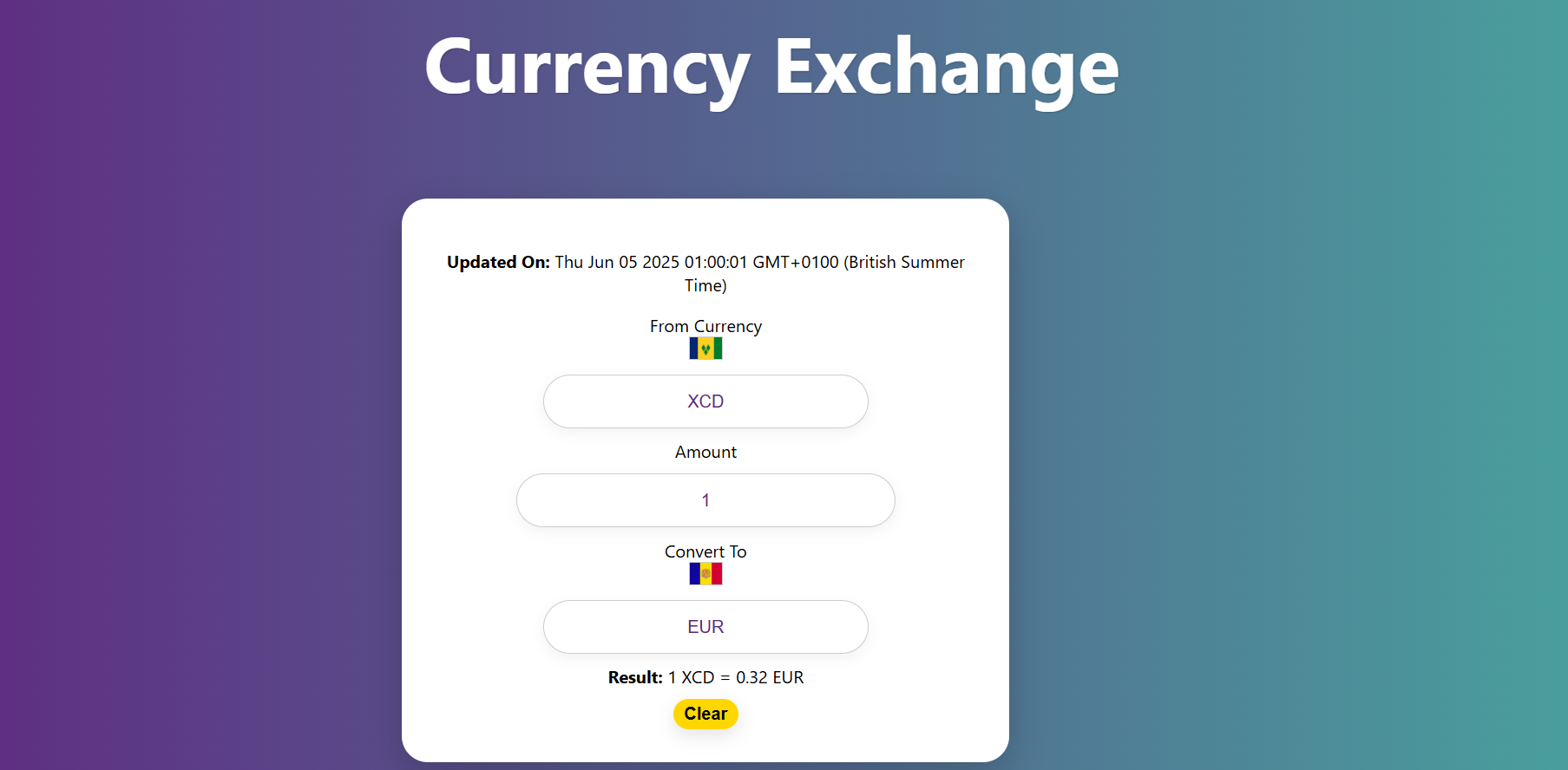 A lightweight React app that, on load, simultaneously fetches all currency codes with flag URLs from REST Countries and current exchange rates from the ExchangeRate API, storing both results in component state. It then renders two dropdown pickers—“From” and “To” currencies—each displaying its flag and code, alongside an input field for the amount. Whenever the user changes the amount or selects different currencies, the app immediately recalculates and displays the converted value using the stored rates, thanks to React’s state and effect hooks.